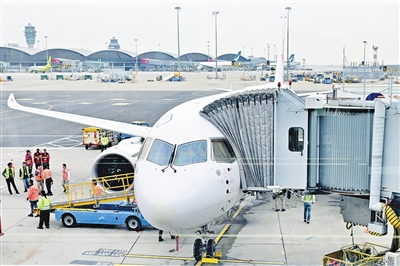 1月1日,东航C919“上海虹桥—香港”MU721首航航班抵达香港后停在停机坪。
