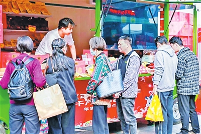 本报讯 日前,广州市北京路步行街的中心大屏上,“罗定豆豉鸡 过年味更浓”的字样格外引人注目,火红的视觉设计颇具年味。近日,“百千万城市会客厅 湾区年货年菜嘉年华”活动在广州开幕,挖掘和推广广东地区丰富的年货年菜文化,促进地方经济发展,提升城市品牌影响力。