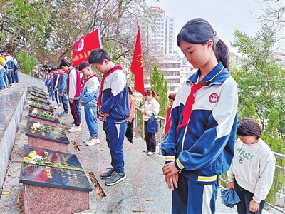 活动中,云浮中学、云浮恒大学校、市邓发纪念中学、云浮实验小学、云浮云石学校、云浮伊顿学校、市一小、市二小等10多所学校的学生及家长代表走进云浮烈士陵园,对烈士纪念设施进行卫生保洁、清扫树叶等杂物、擦拭烈士墓碑,向烈士墓敬献鲜花并默哀致敬(如图),重温红色革命历史,表达云浮学子对革命烈士的哀思和怀念。参与活动的学子表示,将传承红色基因,努力学习,把祖国建设得更加美好。