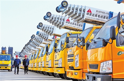 3月30日,在位于山东省青岛市即墨区金口镇的青岛九合重工机械有限公司,员工盘点待出厂的云梯车。