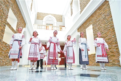 5月17日,在白俄罗斯首都明斯克的白俄罗斯国家美术馆,身着当地民族服饰的孩子们演唱传统歌曲。