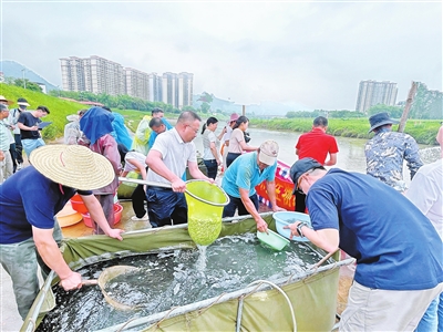 本报讯 (通讯员 张健珍) 5月17日,郁南县在连滩镇南江河亲水平台开展2025年水生生物增殖放流活动,共投放鳙鱼、鲢鱼、鲮鱼、广东鲂等鱼苗约90万尾。