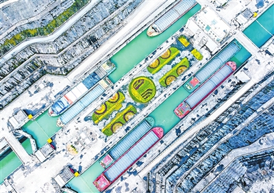 7月1日,在湖北宜昌,船舶有序通过三峡双线五级船闸(无人机照片)。