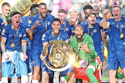 7月13日,切尔西队球员在颁奖仪式上捧起奖杯。