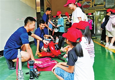活动现场,消防救援人员重点介绍防溺水及自然灾害紧急情况下自救互救的应急技能、火灾预防及灭火器的使用,在互动环节中,通过有奖问答激发小朋友们学消防、知消防、爱消防的兴趣和热情。随后,小朋友们在引导下来到器材展示区和车辆展示区,从防护面罩到破拆工具,从水带接口到救生担架,消防员细致讲解了每件装备的用途和操作原理。参观过程中,小朋友们在消防救援人员的帮助下体验试穿战斗服、抢险服,近距离感受消防员的日常工作,在寓教于乐中“亲密接触”消防知识。