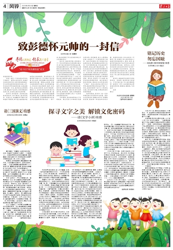 今年暑假,爸爸妈妈带我去了您的故居。踏上您家门口那被岁月磨光的石阶,青苔微滑,我小心翼翼地走着,还遇见了一只慢悠悠的小蜗牛。我忍不住猜想,您小时候是不是也曾在这里,好奇地看着这样的小生灵?院子里绿荫如盖,阳光透过树叶的缝隙,在地上洒下跳动的光斑。我久久地站在您亲手栽种的那棵柚子树下,抬头望去,金黄的柚子挂满枝头,沉甸甸的,散发着生命的芬芳。我轻轻抚摸着粗糙的树干,仿佛能感受到历史的余温,还有您留下的那份坚韧。彭爷爷,告诉您一个小秘密:我家后院也有棵老枣树。我总爱爬上粗壮的树杈,假装自己是您派出的“小哨兵”。每当山风吹过,树叶沙沙作响,我就觉得像是您在远方叮嘱:“小同志,要站好岗啊!”这个小小的游戏让我心里充满了力量,仿佛真的肩负着某种使命。