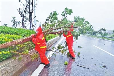 9月19日,公路养护工作人员在清理国道G236线汕尾市捷胜镇路段处的倒伏树木。