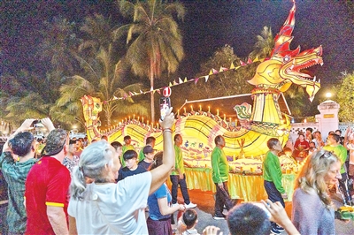 10月8日晚,灯船入水前在老挝琅勃拉邦主要街道游行,老挝民众和外国游客纷纷前来观看。