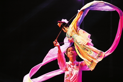 10月11日,在摩洛哥首都拉巴特举行的“天涯共此时”中秋晚会上,艺术家表演木偶长绸节目《秋月》。
