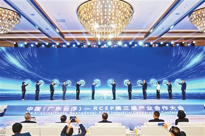 本报讯 (云浮融媒记者 钟敏华 徐登科 特约记者 云伟歆) 10月17日下午,由云浮市人民政府、广东省商务厅、RCEP产业合作委员会共同主办的中国(广东云浮)-RCEP第三届产业合作大会在云浮新兴开幕。大会以“拓展RCEP产业合作、塑造开放开发新优势”为主题,邀请包括RCEP14个成员国政府官员、行业商协会代表在内的500多名海内外嘉宾齐聚一堂,共商合作大计、共绘发展蓝图。广东省委常委、副省长张国智向大会发来祝贺视频。云浮市委书记、市人大常委会主任卢荣春,RCEP产业合作委员会主席许宁宁,商务部国际贸易经济合作研究院“一带一路”经贸合作研究所所长祁欣,柬埔寨商业部国务秘书克里斯托夫·切昂,越南驻华大使馆商务参赞农德莱,韩国中华总商会会长袁国栋,泰-中商务委员会秘书长庄介湘等领导和嘉宾出席大会并致辞。云浮市委副书记、市长李庆新,市政协主席梁丽娴,市委副书记杨骁婷出席大会。