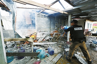 12月11日,在泰国素林府,警察向被炮火损毁的房屋洒水灭火。