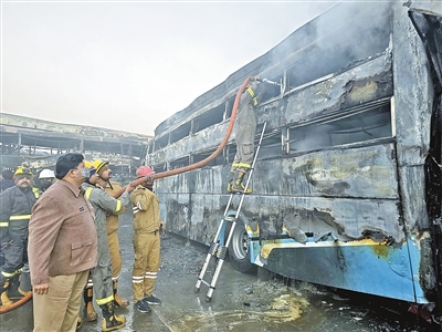 据印度媒体报道,德里至阿格拉高速公路16日凌晨发生10车连环相撞事故,造成至少4人死亡、25人受伤。 (新华社发)