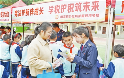 本报讯 (云浮融媒记者 游思明 通讯员 郁税笙) 近日,2025年郁南县“宪法宣传周”暨“法治文化节”宣传活动在郁南县四一八小学举行。国家税务总局郁南县税务局组织“郁税青锋”税费服务团队走进校园,将宪法教育与税收知识普及相结合,为学生们带来一堂生动有趣的法治启蒙课。