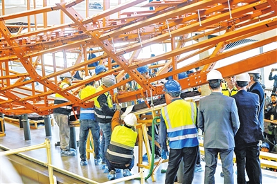 12月23日,在埃及吉萨的大埃及博物馆胡夫太阳船展厅内,埃及修复团队开展古埃及法老胡夫第二艘太阳船的组装工作。