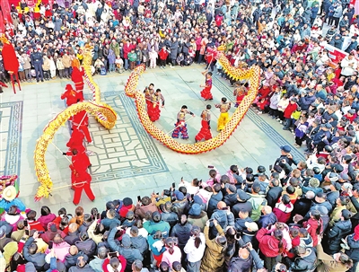 2月4日,在河南省南阳市内乡县衙博物馆,市民、游客在文化广场观看舞龙表演(无人机照片)。